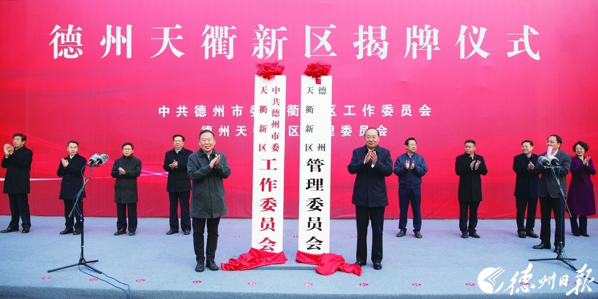 省稳住经济基本盘督导和服务德州组组长、省政协副主席王修林,市委书记田卫东共同为德州天衢新区党工委、管委会揭牌。记者 王志伟 摄