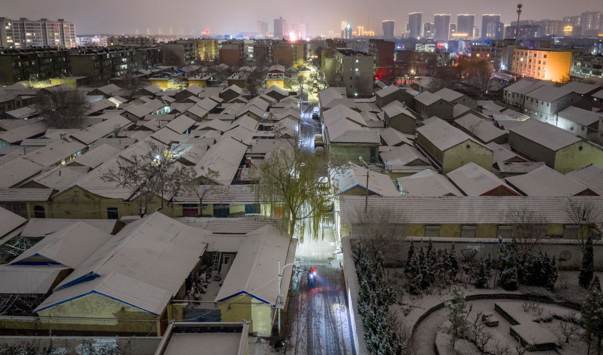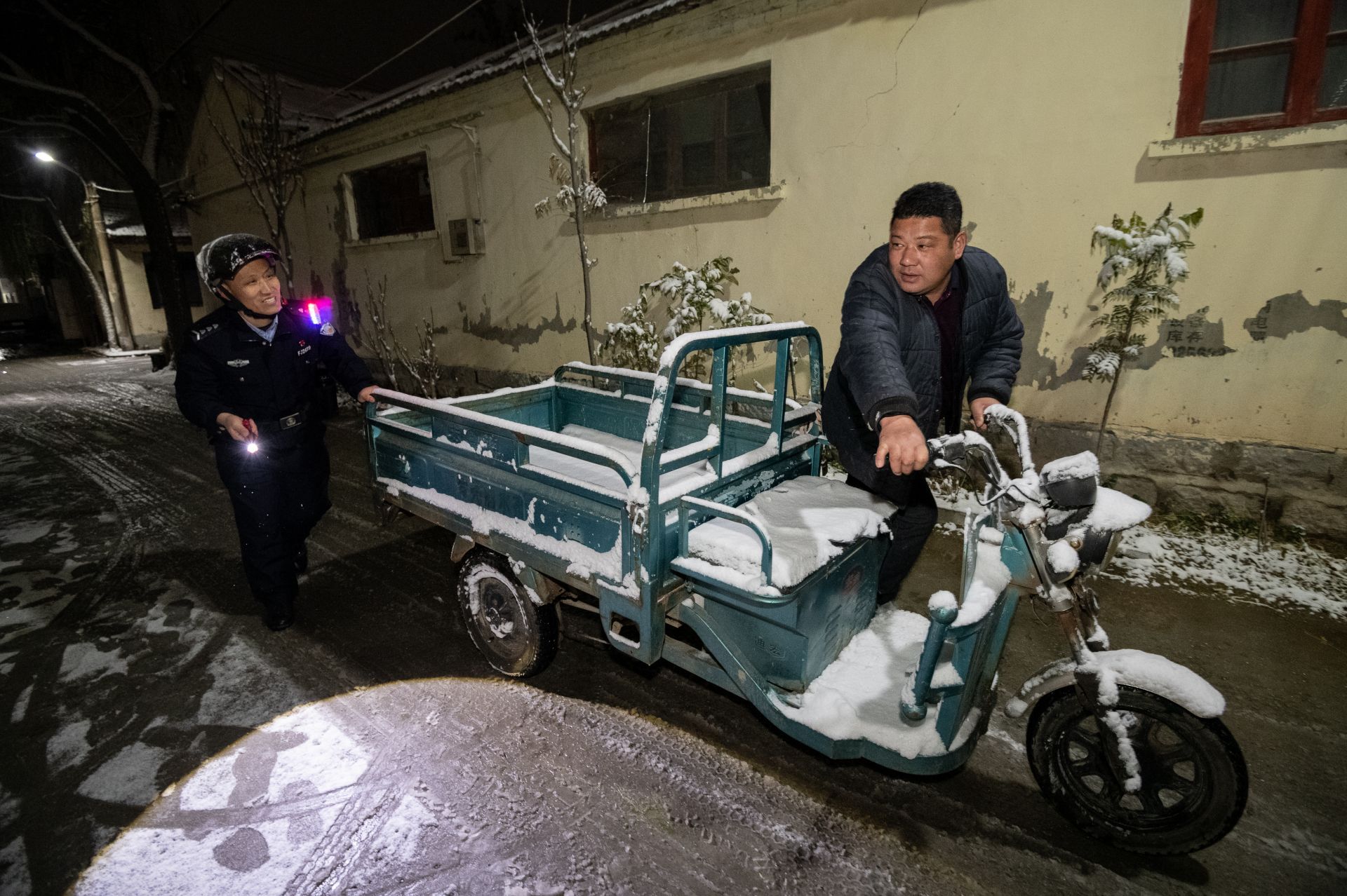 12月12日傍晚,周宪波骑着电动自行车在北营社区冒雪走访